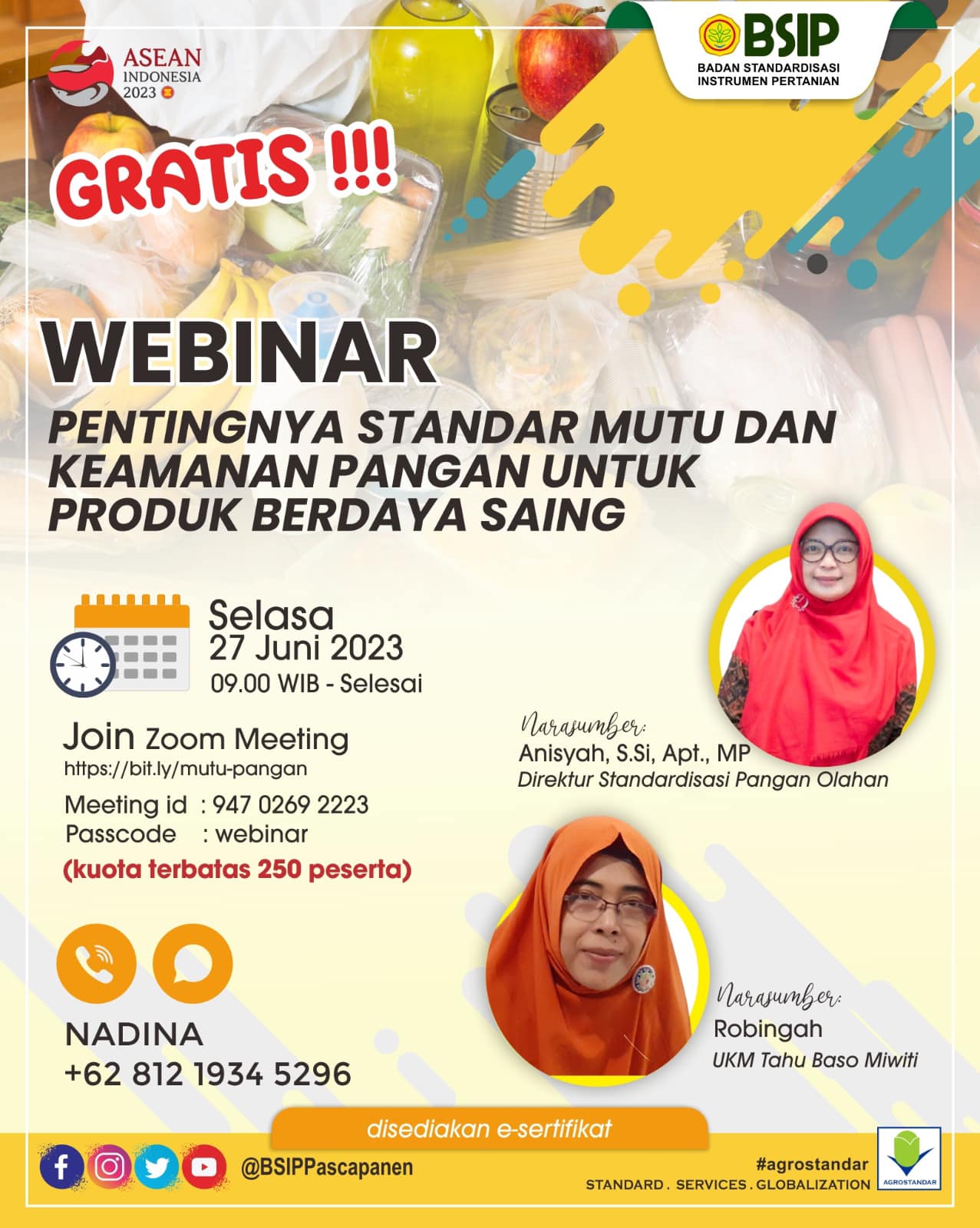 #SobaTani BSIP Pascapanen akan melaksanakan Webinar Pentingnya Standar Mutu dan Keamanan Pangan untuk Produk Berdaya Saing pada Selasa, 27 Juni 2023. Acara ini terbuka untuk umum.
