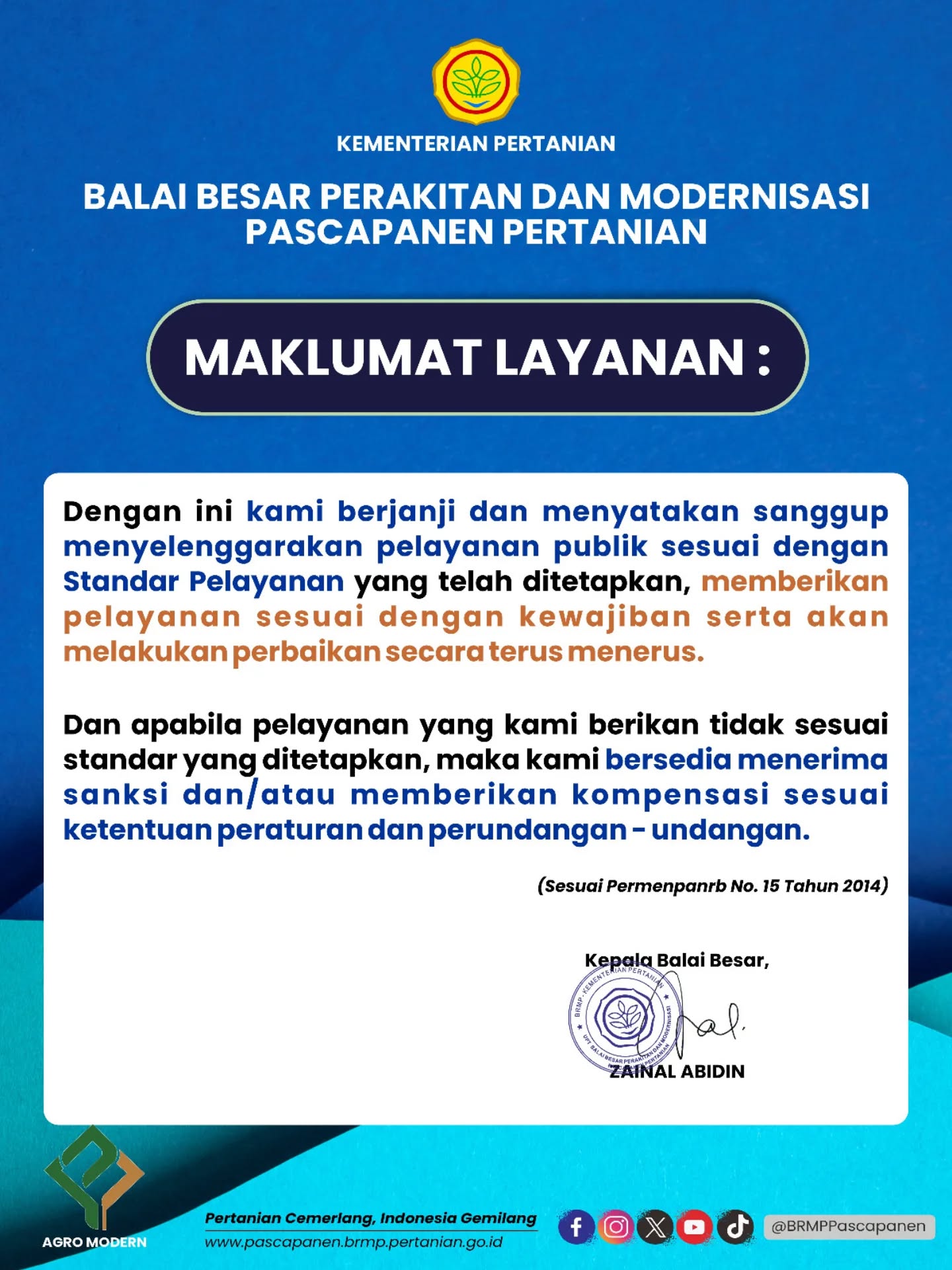 Sebagai badan publik, Balai Besar Perakitan dan Modernisasi Pascapanen Pertanian dengan ini, kami menyatakan sanggup untuk menyelenggarakan pelayanan publik sesuai dengan standar pelayanan yang telah ditetapkan, memberikan pelayanan sesuai dengan kewajiban serta akan melakukan perbaikan secara terus menerus.