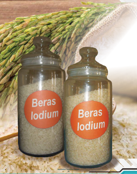 Fortifikasi dilakukan saat proses penyosohan, dengan penambahan iodium 1,0 ppm yang menghasilkan kadar iodium pada nasi sebesar 0,69 ppm, tetap disukai konsumen dari segi rasa, aroma, dan warna. Hasilnya menunjukkan beras kepala tinggi (74,5%) dengan penampakan bersih dan cemerlang. Uji preferensi terhadap penderita GAKI (Gangguan Akibat Kekurangan Iodium) menunjukkan adanya indikasi perbaikan kondisi kesehatan. Untuk menjaga mutu, beras beriodium disarankan disimpan menggunakan metode hermetik dengan kemasan sekunder reflektif agar tahan terhadap serangan hama dan paparan cahaya.