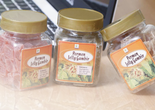 Permen jelly merupakan salah satu jenis produk yang digemari berbagai lapisan masyarakat, terutama anak-anak karena mempunyai rasa yang manis dan kenyal. Bahan pembentuk gel yang biasa digunakan antara lain gelatin, keragenan, dan agar. Pemanfaatan gambir dalam bentuk pangan olahan siap saji yang mudah dikonsumsi belum banyak dilakukan oleh masyarakat luas. Untuk itu, ekstrak sari daun gambir bisa digunakan untuk pembuatan permen jelly.