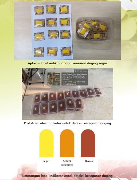 Selama ini proses pengujian terhadap daging segar dilakukan secara manual dengan pengamatan visual namun bersifat subyektif. Pengujian di laboratorium yang bersifat obyektif membutuhkan waktu lama dengan biaya yang cukup mahal. Seiring perkembangan teknologi, saat ini telah hadir kemasan pintar untuk produk pangan. Kemasan pintar dilengkapi dengan adanya label indikator sebagai sensor kimia yang akan mendeteksi penurunan kualitas dari bahan pangan termasuk daging segar. Label indikator dalam kemasan akan mendeteksi senyawa yang disintesis oleh mikroorganisme atau enzim yang terikat dan terakumulasi dalam indikator sehingga meyebabkan perubahan warna. Perubahan warna dari indikator dapat digunakan untuk mendeteksi senyawa volatile yang bersifat asam atau basa. Label indikator dapat digunakan untuk mendeteksi tingkat kesegaran daging sapi dalam waktu yang cepat dan akan menunjukkan warna kuning untuk daging segar, warna oranye untuk daging kurang segar dan warna merah untuk daging tidak segar.